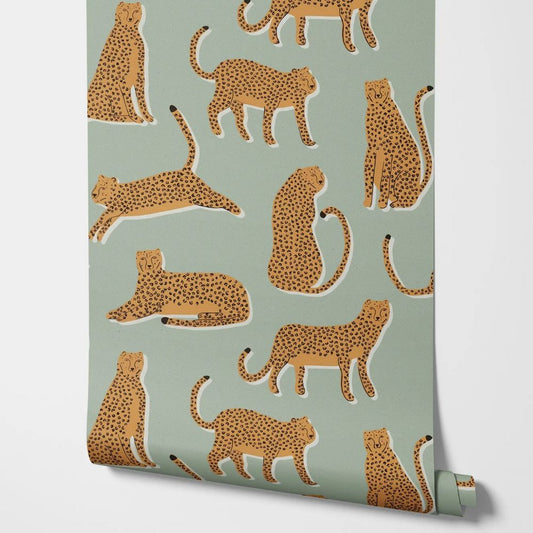 Papier peint léopard fond vert sauge